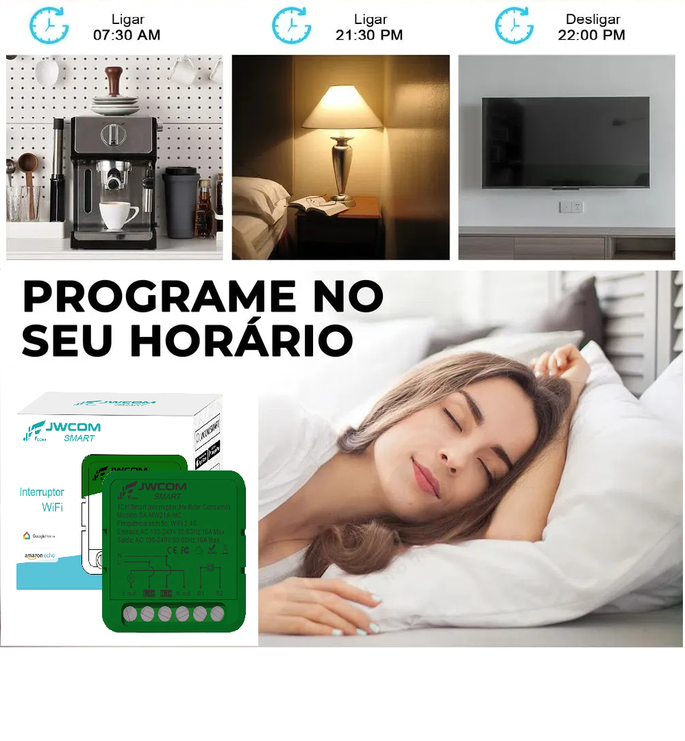 Você pode programar horários para ligar e desligar aparelhos, além de criar cenas inteligentes para automação.