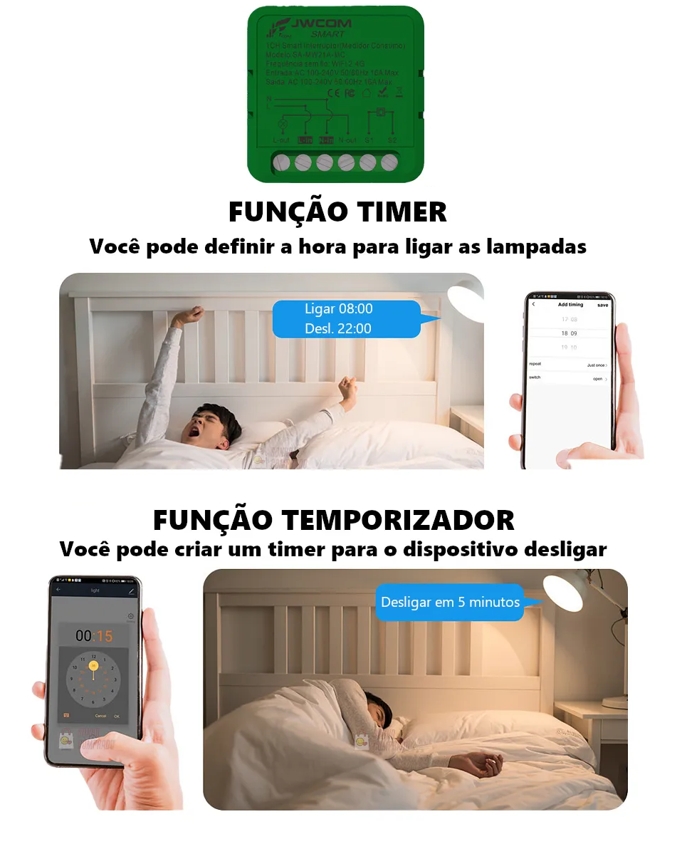 Este mini módulo interruptor inteligente permite controlar a iluminação e outros aparelhos de forma remota, via aplicativo de celular e comandos de voz, e também mede o consumo elétrico de cada aparelho conectado a ele. O mesmo é conectado à rede Wi-Fi, permitindo agendar horários e visualizar o histórico de consumo.